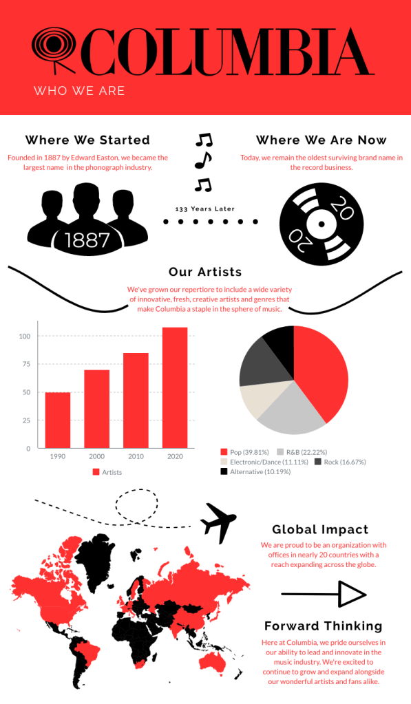 With offices on nearly every continent, Columbia’s worldwide presence ensures that we reach as many fans as possible. Communication across international offices is crucial to us, as we value the unique insight of each area to facilitate holistic collaboration. Our widespread outlook allows us to look ahead to the future while thriving in the present, a statement we take to heart here at Columbia.